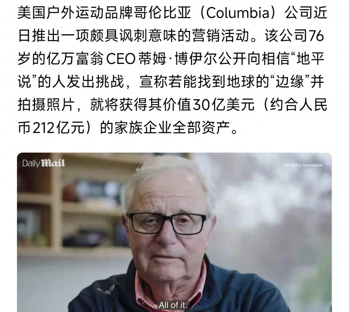 最近,这个“地平说”又火了起来,一位来自美国的超级富豪,蒂姆·博伊尔公开向相信“地平说”的人发出挑战,宣称只要能拍到地球边缘平的,也就是找到地球的“边缘”并拍摄照片,就可以获得他价值2百多亿人民币的全部资产,其实很多人都知道,这是他本人的营销虚头,无论你通过Ai算法去伪造,也根本不可能完成这个挑战,普通人连上天的能力都没有,只能说他是在讽刺地平说者。